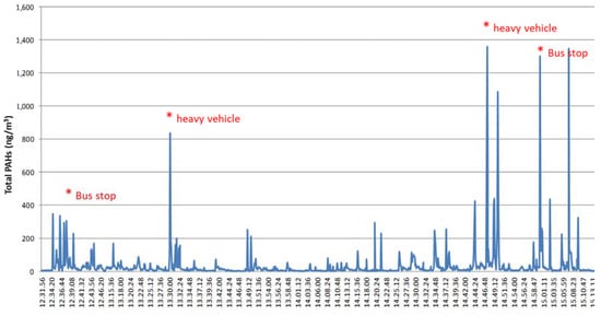 As shown in Figure 6, the two parallel streets of the monitoring pathway, although both downwind to the steel plant, did not show similar concentrations of total p-PAHs, decreasing with the distance from the industrial source and especially from the coke ovens. Taking into account the short duration of the monitoring experiment and the comparable traffic flow along both the parallel streets, it is possible to observe that the main street called Via Orsini showed higher values than via Lisippo, suggesting that this difference was due to the vehicular traffic source in addition to pollutant transport from the industrial source. The vehicular traffic source contribution was also confirmed by hourly concentrations of total p-PAHs, reported in Figure 7. The highest concentrations, indeed, were associated with the movement of both buses for public transportation and trucks that, through the urban streets, have direct access to the industrial area. Moreover, it is important to underline that the fixed environmental monitoring station Orsini is close to the bus station where vehicles stop for a while before leaving again. Therefore, the mobile monitoring experiment of total p-PAH concentrations revealed to be a useful tool to identify the vehicular traffic as an additional and not negligible source of p-PAHs and to highlight the potential high short-term effect that vehicular traffic sources could have on the health of the exposed general population and, specifically, on those professionals, such as traffic policemen, spending a long time at the road crossings. Indeed, as shown in Figure 7, real-time total p-PAH concentrations (mean value equal to 33.4 ng/m3) at the road crossings on the monitoring pathway can reach values higher than 1 μg/m3, confirming the findings of previous studies performed in European, South American and Asian countries, such as Mexico City [13], Zurich [14], Beijing [14], Paris [34] and Tokyo [34] (Table 3). More specifically, in this study, higher concentrations were registered in correspondence with the bus stops along the monitoring pathway and were generally related to both bus and truck movement in the investigated area, suggesting that their contribution to the p-PAH concentrations is greater than that solely related to the passenger vehicles [35], and is similar to the biomass burning contribution [36]. Moreover, these peak concentrations were higher than those registered in other cities worldwide, such as Bangkok [10], Basel [16], Tokyo [10,27], Hong Kong [30], Aosta (Italy) [37], Quito (Ecuador) [38], Los Angeles [39] and Roxbury (Massachusetts) [40], where the highest hourly concentrations of total p-PAHs ranged from 186 ng/m3 (Tokyo) to 475 ng/m3 (Aosta) (Table 3).