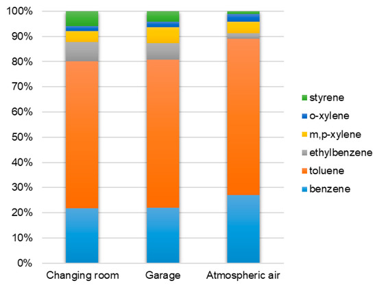 The BTEXS profiles (i.e., the percentages of individual BTEXS compounds in the total BTEXS concentration) in the changing room and garage were very similar. However, they differed from the BTEXS profile for the atmospheric air outside the fire station (Figure 1). In both rooms and outside, toluene had the highest share in ∑BTEXS (58% in the changing room, 59% in the garage, and 62% outdoors). In the whole measuring period, toluene concentrations were in the range 265–703 µg/m3 in the changing room, 425–692 µg/m3 in the garage, and 51–131 µg/m3 in the atmospheric air. Benzene had the second largest share in ∑BTEXS (an average of 22% both in the changing room and the garage and 27% in the atmospheric air). It should be noted that toluene and benzene concentrations are reduced through their reactions with OH radicals, with the rate constant of toluene being approximately five times larger than that of benzene [32]. This explains the differences in the concentrations of these compounds. The average percentage of ethylbenzene and styrene among the BTEXSs inside the garage and the changing room was about four times higher than that outside. This suggests an internal source of these compounds in the analyzed rooms.