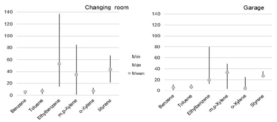 In addition, the large differences between the BTEXS concentrations in the fire station rooms and in the surroundings suggest that the main sources of BTEXSs in the changing room and garage were the combustion products settled on uniforms, personal protective equipment, and the equipment used during firefighting. The standard deviations for the BTEXS concentrations in the garage were smaller than those in the changing room. Outside, the proportions of standard deviations relative to the average concentrations were very high—higher than those for the measurements inside. The BTEXS concentrations outside the fire station, although many times lower than those inside, were several times higher than, for example, the BTEXS concentrations observed in other urban areas, such as Tri-City, Tczew (Poland) [28], Hamburg (Germany) [29], or Pamplona (Spain) [30]. It is likely that this is related to the fact that the ambient air in the southern part of Poland (Upper Silesia) is more polluted than the air in other parts of the country. This pollution is caused by mining activities and intensified heating processes, especially since the measurements were conducted in winter [31].