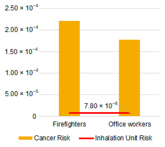 The carcinogenic risk associated with the inhalation of benzene was calculated as 2.21 × 10−4 for firefighters participating in firefighting activities and 1.77 × 10−4 for office employees of the fire station (Figure 3). Both values are above acceptable cancer risk levels according to the Inhalation Unit Cancer Risk (IUR) (>7.6 × 10−6) [26,43,44]. The differences in risk values result from the different durations of working shifts between the individual exposure groups. Firefighters participating in rescue and firefighting operations perform 24-h shifts three times a week, while office workers work eight hours a day, five days a week. In the carcinogenic risk assessment, only benzene concentrations were used, while the concentrations of other pollutants, such as PAH or PM-bound substances, were not taken into account. In addition, the concentrations that prevail during fires were not taken into account. Firefighters use breathing apparatus and other personal protective equipment when extinguishing fires, but there are situations when they take that equipment off, such as during exterior operations (e.g., pump operations), immediately after extinguishing fires, when collecting equipment, or in fire truck cabins during their return from action. It can be assumed that then BTEXS concentrations are higher than in the garage or changing room [3]. Therefore, the risk may be even higher than calculated. Studies also show that the health exposure associated to hazardous combustion products does not only apply to firefighters extinguishing fires but also to dispatchers, commanders, and secretaries (i.e., people whose work rooms are often located near garages and changing rooms).