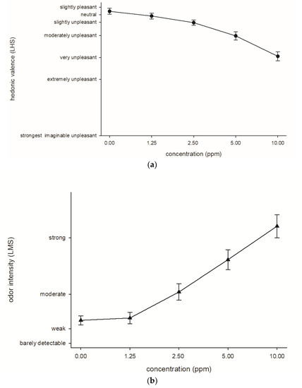 - Smeets, M.A.; Bulsing, P.J.; van Rooden, S.; Steinmann, R.; de Ru, J.A.; Ogink, N.W.; van Thriel, C.; Dalton, P.H. Odor and irritation thresholds for ammonia: A comparison between static and dynamic olfactometry. Chem. Senses 2007, 32, 11–20. [Google Scholar] [CrossRef] [PubMed]