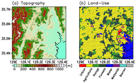 (a) Surface elevation of the study area, and (b) the land cover type. In (b), the locations of the surface Automated Surface Observing System (ASOS) station (open red triangle), automated weather stations (AWS) stations (open purple triangles), and the emission source (filled red triangle) are indicated. Three circles indicate the distances from the emission source as 5, 10, and 15 km.