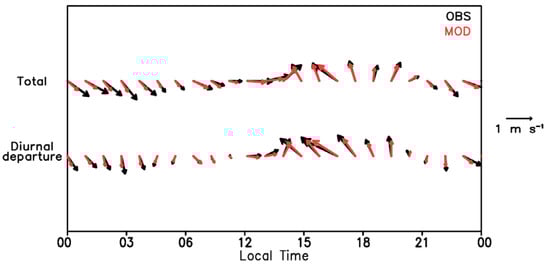 Comparison of local wind vectors (upper) and their diurnal departures from the daily average (lower) obtained from the ASOS observations (black) and the CALMET simulations (red) at the Ulsan station indicated in the open red triangle in Figure 1. The model simulation is the average of the nearest four grid points to the observation station. The hourly wind vectors are the monthly averages each hour for August 2013. The unit is m s−1.