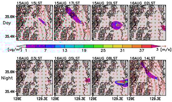 Figure 3 compares the sample cases of benzene dispersion in time during the daytime and the nighttime accidents. These cases are chosen as the typical cases in the summertime weather in Ulsan, characterized by the local land–sea breeze circulation. The chemical dispersion pattern depends largely on the specified wind condition. The initial direction of the plume and the level of surface concentration is quite different between the daytime emission-started and the nighttime emission-started cases. When the emission starts in the afternoon at 14:00 LST, the emission plume tends to spread to the northwest by the developing sea breeze in the one hour after. It tends to move further northwestward by the enhanced sea breeze in the three hours after. The plume also becomes wider in the cross-wind direction by the diffusive nature of Gaussian puffs. Six h later at 20:00 LST, the sea breeze slows down and the overall wind becomes calm. The surface concentration shows a circular pattern with a slight stretch in the zonal direction by background winds. At 12 h after at 02:00 LST, the wind becomes northerly, suggesting the development of the land breeze in the nighttime, and the plume is advected toward the ocean. The surface concentration in the downstream tends to increase a lot by the nighttime suppression of the atmospheric boundary layer. Compared with the southerly sea breeze, the land breeze is much weaker and this is consistent with the results shown in Figure 2.