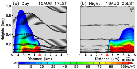 Vertical cross-section of benzene concentration (shading) along the surface wind direction at the source point. The concentration at (a) 17:00 LST 15 August, which is three hours after the daytime emission started at 14:00 LST, and at (b) 05:00 LST 16 August, 3 h after the nighttime emission started at 02:00 LST. The x-axis indicates the distance in km from the emission center and the y-axis the vertical height in km from the ground. The exact lines for each vertical cross-section are taken along the red and purple lines in Figure 1 for the daytime and the nighttime emission-started cases, respectively. Wind (arrow) and the source point (red triangle) are indicated in each figure. Note that the vertical motion is exaggerated by multiplying the vertical wind component by 100.