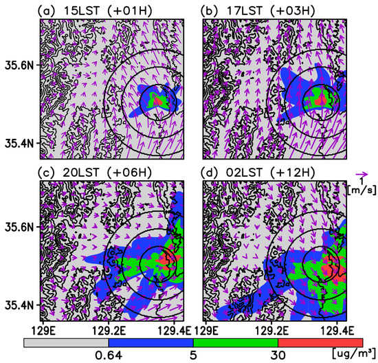 Time-averaged benzene concentration (shaded, unit: μg m−3) and surface wind (arrow, unit: m s−1) of the daytime emission-started cases. Each panel shows the patterns at (a) 15:00 LST, (b) 17:00 LST, (c) 20:00 LST, and (d) 02:00 LST, which are 1, 3, 6, and 12 h after the emission starts, respectively. Also shown is the topography (contour in black). Three circles indicate the distance from the emission source to 5, 10, and 15 km.