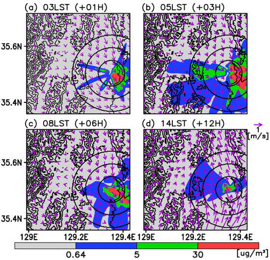 In the nighttime emission-started case, the initial plume moves eastward by weak background westerlies in the one hour after. The concentration tends to increase further in the downstream in the three hours after, with a more stretched plume in the along- and cross-wind directions. Six h later at 08:00 LST, the surface concentration tends to decrease, presumably due to the dilution by the development of the atmospheric boundary layer in the morning. The plume changes drastically in direction and it moves to the northwest by the strong sea breeze circulation in the afternoon at 14:00 LST, in the 12 h after emission.