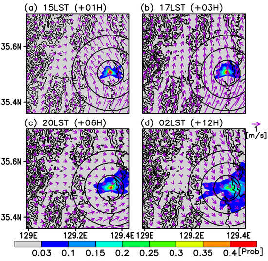 Throughout the nighttime emission-started cases (Figure 8), the hit rate tends to increase in the downstream side, following the land breeze until the morning. The most contrasting feature to the daytime cases is the rapid increase of the hit rate for the initial 3 h. The hit rate becomes as high as 20% near the 5 km radius from the source in one hour, and then 20–30% in 6 h. In 12 h, the hit rate tends to increase more than 35% in the downstream side at the 5 km distance. In 12 h, the circulation is reversed and the hit rates tend to be steady or slightly decrease in the windward side. The result suggests that the risk area with more than 3% of the hit rate can expand up to the 15 km radius within 6 h after the accident. Therefore, a broader region should be monitored for an accident that may occur in the nighttime.