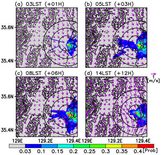 Time-organized hit rate of benzene concentration exceeding 30 ug m-3 (shaded) at each grid point and surface wind (arrow, unit: m s−1) of the nighttime emission-started cases. Hit rate is defined as the total count of the case divided by the elapsed hour from the emission starting time and the total number of the day. Each panel shows the patterns at (a) 03:00 LST, (b) 05:00 LST, (c) 08:00 LST, and (d) 14:00 LST, which are 1, 3, 6, and 12 h after the emission starts, respectively. Also shown is the topography (contour in black). Three circles indicate the distance from the emission source to 5, 10, and 15 km.