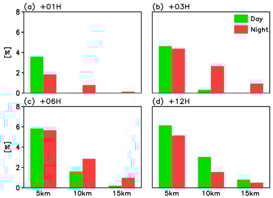 The risk assessment based on the accumulated hit rate in the above highlights that the vulnerable area expands more quickly in the nighttime emission-started cases in the downstream side, thereby increasing the potential health risk in the affected region. To examine this difference in a quantitative way, this study compares the accumulated hit rate averaged over land within the 5, 10, and 15 km radius from the emission source (Figure 9). In one hour, most of the exposures are concentrated within the 5 km radius after the daytime emission starts. The exposures over the area within the 5 km radius are less frequent in the nighttime emission-started cases, with the probability of about half of the daytime emission-started cases, but it shows the exposures even at 10 and 15 km. This indicates that the nighttime dispersion spreads much farther than the daytime dispersion so that it could affect the residents in the farther area. The exposures increase steadily for the daytime emission-started cases at all distances. On the other hand, the probability of exposures seems to be saturated after 3 h in the nighttime emission-started cases, showing almost comparable values to the values after 6 h. Then, it tends to decrease slightly within 12 h, when the local circulation changes into the sea breeze in the afternoon.