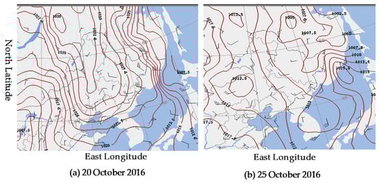 Sea level pressure at 11:00 (hereafter Beijing time). (a) 20 October 2016; (b) 25 October 2016
