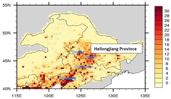 Figure 2 shows the distribution of BC emissions in October 2012 based on the output data of the latest Multi-resolution Emission Inventory for China (MEIC) (http://www.meicmodel.org/index.html), He (2012) [31] reported the model framework and 1990–2010 anthropogenic emissions on MEIC. As seen, Harbin and the surrounding areas emit much BC. In the map, Harbin, Daqing, Changchun, and Shenyang are marked. Figure 2 shows that Harbin and Daqing are the major emission regions of BCs in Heilongjiang Province.