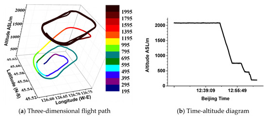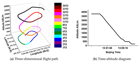 On 25 October, the descent phase was from 12:43:47 to 13:06:35. The flight path is shown in Figure 4. The flight duration was approximately 23 min. The flight range was from 45.52° N to 45.62° N and from 126.58° E to 126.78° E. The aircraft descended spirally from a high altitude of 3781 m to the ground at 193 m ASL. More specifically, the aircraft circled 1 round at a height of 3400 m and then descended spirally to the ground. During the entire flight, the aircraft circled 3.5 rounds, and each round lasted approximately 7 min.