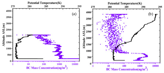 Potential temperature (black solid line) and black carbon aerosol (BC) mass concentration (purple solid squares) detected by the two flights in October 2016: (a) 20 October 2016; (b) 25 October 2016.