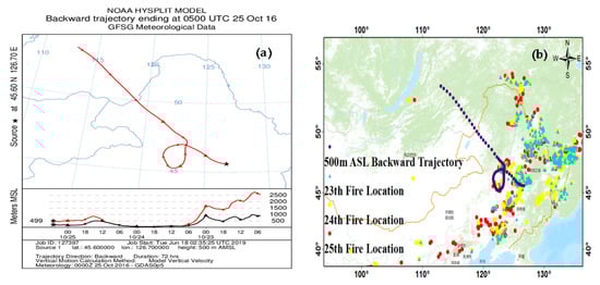 The 72-h backward trajectory and satellite fire spots. (a) Horizontal and vertical section of the 72-h backward trajectory (black line represents the topography); (b) combined view of the 72-h backward trajectory and three-day satellite fire spots from 23 October to 25 October.