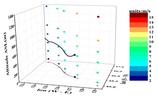 The FNL horizontal wind speed at 14:00 on the vertical section near the projected point of the backward trajectory of the last 13 h (the black thick line is the backward trajectory. The red dots and black thin line are the projection of the trajectory on the xOy plane. The black star is the starting point of the trajectory).