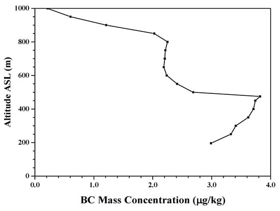 Therefore, the vertical distribution of BC concentration can be as shown in Figure 10 in the actual atmosphere in the flight area during the observation period. This means that the horizontal variability of the BC concentration in the lower and middle layer of the atmospheric mixing layer may be sufficiently large in the early phase of the heating period even though the Ping Fang District in Harbin covers a horizontal area of only 10–20 km. As a result, false elevated BC concentration layers may be detected during spiral flight measurements.