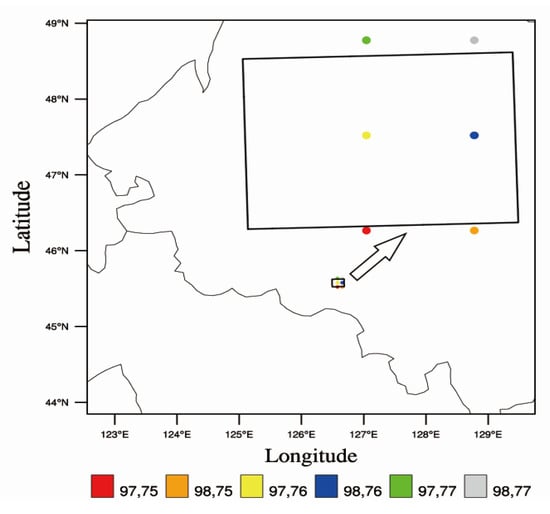 Position of the flight area (area in the black rectangular box) and the six grid points (colored circles. The grid points are named with a pair of numbers in the simulated area. The two numbers represent the position in the west-east and south-north directions, respectively.).