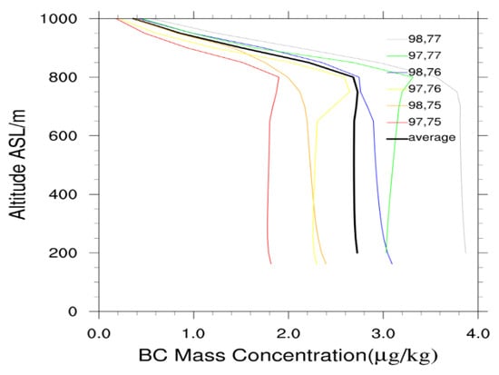 Figure 9 shows the location of the flight area and the six nearby ground grid points in the simulation. Figure 10 shows the vertical distribution of the simulated BC concentration at 13:00 on 25 October at these points. We can find in Figure 10 that all of these BC concentration vertical profiles don’t display the peak at the height of approximately 500 m, but they show that the BC concentrations under the altitude of 800 m do not change with height. In addition, Figure 10 shows that the difference between any two vertical profiles is large. This finding reflects that the horizontal variability of BC concentration is relatively large. Combining Figure 10 with the locations of the six grid points (Figure 9), it can be seen that, for the simulation results of BC concentration below 800 m altitude, the concentration in the southwest of the flight area is lower than that in the northeast, which horizontal distribution is consistent with the MEIC ground emission rate distribution of black carbon aerosol in October 2012 (see Figure 11) used by the simulation in this paper.