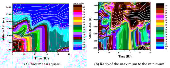 We can see from the above that we must be cautious in the horizontal heterogeneity of BC concentration. The root mean square of the simulated BC concentration and the ratio of the maximum to the minimum simulated BC concentration among the six grid points (Figure 12) show that between 8:00 and 14:00 the horizontal variability of the BC concentration among the six grid points did not change with the altitude in the mixing layer. Above the mixing layer, the root mean square decreased rapidly with the altitude, while the ratio of the maximum to the minimum was larger than the value within the mixing layer. As the thickness of the mixing layer increased, the root mean square in the mixing layer decreased, while the ratio of the maximum to the minimum increased.