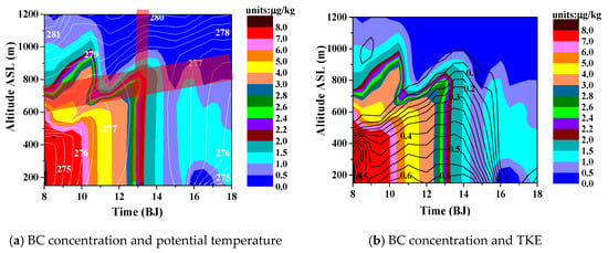 Simulated time-altitude diagram of the BC concentration (shading, unit: μg/kg), potential temperature (white contour, unit: K), and TKE (black contour, unit: m−1 s−1) at grid point (97, 76). (a) BC concentration and potential temperature; (b) BC concentration and TKE.