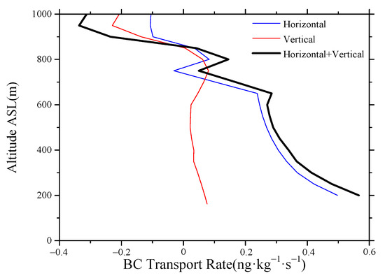 Figure 14 shows the simulated profiles of the horizontal advection transport rate, the vertical advection transport rate, and the total advection transport rate (which is the sum of the first two) of the BC concentration at grid point (97, 76) at 13:00. It can be seen that the simulated total advection transport rate was negative at altitudes above 850 m and positive at altitudes below 850 m. Except for certain altitudes, the simulated horizontal advection transport rate was greater than the vertical advection transport rate. The simulated total advection transport rate shows a peak at approximately 650 m and 800 m, but the simulated BC concentration only shows a peak at 800 m. This result could be related to the fact that the former has greater turbulent energy than the latter (Figure 13b). The simulation results of this case show that compared with the upper layer of the mixing layer, the turbulent energy in the lower and middle layers is larger, and there is no particularly prominent peak advection transport. Therefore, the simulation results do not show the peak value of BC concentrations at approximately 500 m.