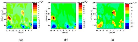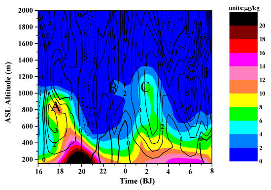 That is, the vertical advection rate of the BC concentration can be approximately decomposed into the BC concentration term and the vertical BC concentration gradient term . Figure 16 is the simulated time-altitude diagram of the vertical advection transport rate, the BC concentration term , and the vertical gradient term of the BC concentration . It can be found that, despite the weak vertical flow, the two elevated BC concentration layers, A and C, corresponded to high values of the vertical advection transport rate of the BC concentration. That the convergence of the vertical upward flow just occurred at the altitude of the high BC concentration indicates that A was mainly caused by the BC concentration term ; C was mainly caused by a combination of the vertical upward velocity and the vertical gradient of the BC concentration, that is, the vertical BC concentration gradient term . From Figure 17, one can see that some convergence zones (such as zone D in Figure 17a) of the upward flow were too high in altitude, where the BC concentration was too low, and thus, no positive vertical advection transport rate occurred. Some strong upward flow zones showed no positive vertical advection transport rate of BC concentration because there was no corresponding large vertical BC concentration gradient, and thus, no elevated BC concentration layers occurred. None of the downward flows formed a positive vertical advection transport rate of BC concentration. Comparing Figure 16 and Figure 17, we can see that in the numerical simulation results of the case in this paper, the number of vertical flow convergence zones is greater than the number of elevated zones of the vertical advection transport rate of the BC concentration. Flow convergence in the high BC concentration areas facilitated the formation of elevated BC concentration layers. The analysis above also indicates that the proper combination of a weak vertical flow with the BC concentration or the vertical gradient of the BC concentration is also conducive to the formation of elevated BC concentration layers. Specifically, if the BC concentration in the convergence region of weak vertical upward flow is sufficiently large or the vertical gradient of the BC concentration at the center of weak vertical upward flow is sufficiently large, the conditions are conducive for the formation of elevated BC concentration layers.