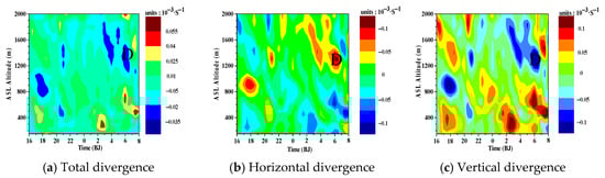 Time-altitude diagram of the simulated divergence from the evening of 24 October to the morning of 25 October. (a) Total divergence; (b) Horizontal divergence; (c) Vertical divergence.