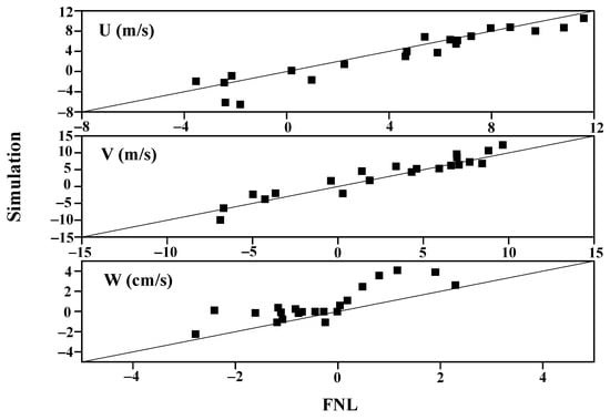 Notably, we just use the simulation results to calculate the above values, including the vertical advection transport rate and the divergence, in calculation, we use the simulated velocity and BC concentration. However, there are not any sounding data of BC and velocity to test the model results. We have to use FNL (six-hour global NCEP/NCAR reanalysis Final) data. As we know the FNL data cannot provide BC data, so we just consider velocity. The simulated velocity is compared to FNL data at 20:00 on October 24, 02:00 and 08:00 on October 25 over Daqing area at the pressure of 1000, 975, 950, 925, 900, 850, 800 hPa. Figure 18 shows the velocity scatter point of FNL versus simulation, in which U, V, W represents the east-west component of the wind, the south-north component of the wind, and vertical component of the wind, respectively. Figure 18 displays that the simulation matches the FNL well for U and V, but W is overestimated.