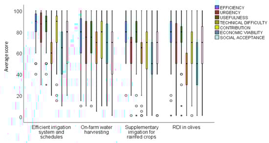 Box plots of the average score of each of the seven criteria for the recommended measures of drought stress group that address irrigation adaptation options to climate change impacts on agricultural sector in Cyprus.