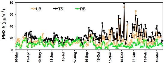 As could be expected, the highest mean PM2.5 value was registered in the TS (23.4 μg·m−3), the lowest in the RB (10.0 μg·m−3) and an intermediate value was found for the UB (15.5 μg·m−3). These values may be compared to the annual EU target value of PM2.5 (25 μg·m−3, 2008/50/EC [1]).