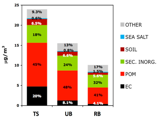 The contribution of main aerosol components to PM2.5 was estimated on the basis of the measured chemical composition. Annual average values for the three sampling sites are reported in Figure 2. Particulate organic matter (POM), i.e., the sum of all the organic compounds, was estimated by multiplying the OC concentration by specific POM/OC factors to take into account the contribution of the other light elements contained in these compounds (like H, N and O). Different factors have been shown to be valid for different types of sites, with increasing values from traffic to rural sites: in agreement with literature, factors 1.4, 1.6 and 2.0 were used in this study for the TS, UB and RB, respectively [27,28]. The secondary inorganic component was obtained just adding nitrate, sulphate and ammonium. Mineral dust was calculated following the oxide formula method, i.e., as the sum of all the main crustal element oxides [29], with K and Fe enrichments corrected by using typical elemental ratios for the upper crust composition [30].