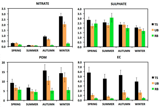 Seasonal averages of POM, EC, nitrate and sulphate in the TS, UB and RB sampling sites.