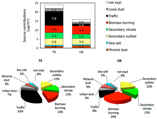 The average source apportionment is shown in Figure 4. As can be seen, the absolute contributions of the different sources at the TS and UB sites are quite similar, with the exception of the traffic component, which, as expected, is sensibly higher in the TS: in the first approximation, we can say that the difference of total PM between the two sites can be ascribed to this source. In regard to relative contributions, the TS site traffic is the main source (33%), followed by biomass burning (16%), secondary sulphate (15%), and secondary nitrate (14%), while significantly smaller contributions are given by urban dust (7%), mineral dust (4%) and sea salt (3%). In the UB site the highest percentage contribution is given by biomass burning (29%), followed by secondary sulphate (22%) and secondary nitrate (15%); traffic accounts only for 8% of the PM2.5 mass, urban dust for 5%, mineral dust for 9%, and sea salt for 3%.