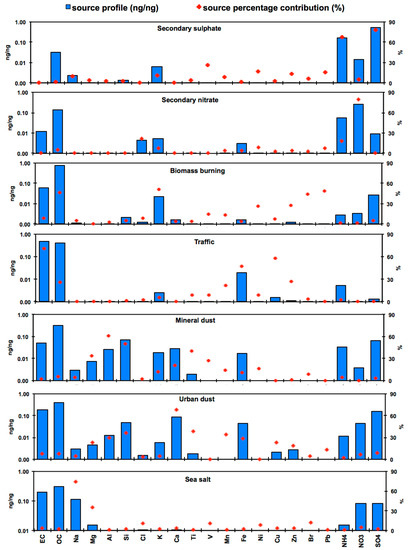 Source profiles are shown in Figure 5, while the time trends of daily source contributions for UB and TS are reported in Figure 6 (gaps in the data are due to sampler malfunctioning).