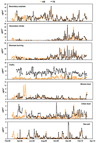 The secondary sulphates source category is mainly composed of SO42- and NH4+ and it is likely associated with a regional secondary component, which originates by photochemical reactions from atmospheric SO2 [32], which is in turn mainly emitted by thermoelectric power plants, and quickly distributed on a regional scale. Daily concentrations of this source are indeed almost identical in the two sampling sites as shown in Figure 6; average values (±the st.dev. of the mean) are 3.6 ± 0.2 μg·m−3 at the TS and 3.4 ± 0.2 μg·m−3 at the UB. Similar concentrations were found in previous source apportionment studies in Tuscany [7,23,33]. Higher concentrations values were found in spring and summer periods, when, as mentioned before, the enhanced photochemistry and the higher air circulation favour the formation of secondary sulphates and their distribution on the regional area. The presence of OC suggests that sulfuric acid catalyses heterogeneous reactions of atmospheric organic carbon species when secondary sulphate is produced, resulting in the formation of secondary organic aerosols [34].
