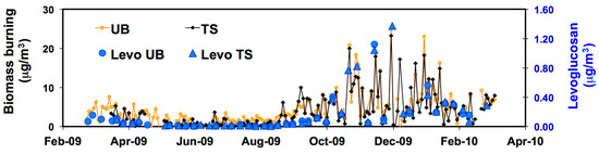 The biomass burning source, mainly composed by OC and EC, is characterized by typical trace elements like K, Cl, Zn, Br and Pb. The OC/EC ratio in its profile is within the ranges reported in literature for a biomass burning source [23,35,36]. The time pattern, which is almost identical at TS and UB sites, shows a strong seasonality with higher values in winter, due to the use of biomass burning for domestic heating, and extremely low concentrations in spring and summer. This source gives a slightly higher mass contribution in the UB site (average values are 3.9 ± 0.4 μg·m−3 at TS and 4.6 ± 0.3 μg·m−3 at UB), which is a residential area near the surrounding hills; nevertheless, the similarity of the temporal trends, together with the fact that chimneys are thought to be sparse inside the city centre, point to a diffuse source in the residential area around Florence. The identification of this source as biomass burning is also confirmed by the concentration of levoglucosan, which is a specific tracer of this source. This compound was measured only for a subset of samples (84), hence it was not included in PMF, however measured concentrations were compared with the daily concentrations of the PMF source shown in Figure 7 and a good agreement was observed, with a levoglucosan/source ratio of 0.05, which is in the range reported in literature for a biomass burning source [35,36].