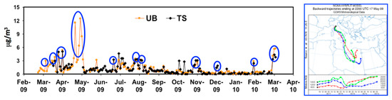 The time series of the mineral dust source have a high correlation between UB and TS sampling sites shown in Figure 8, and similar absolute values (average concentration ~ 1 μg·m−3 in both sites). Intense isolated mass concentration peaks that are simultaneous in all the sampling sites characterize it. HYSPLIT back-trajectory analysis [26] revealed that these peaks occurred when air masses provenience was from the Sahara Desert area, as shown in Figure 8.