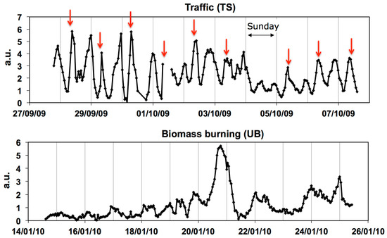 To this aim, the hourly temporal series of the biomass burning and traffic sources are shown in Figure 9. As can be seen, the temporal pattern of the biomass burning source exhibits daily variations with mass concentration peaks during evening and night hours. This behaviour reinforces its identification as a biomass burning source for domestic heating. The traffic source time trend shows a different periodic pattern, with peaks during traffic rush hours: an increase of this source can indeed be observed every working day morning at about 8:00 a.m. (as highlighted by the red arrows in Figure 9), while a significant reduction can be seen during Sunday (with the shift of the morning peak from 8:00 a.m. to 10:00 a.m.–11:00 a.m.).