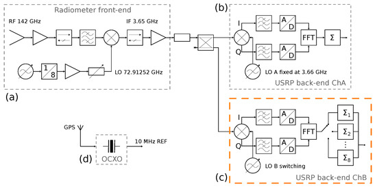 The Universal Software Radio Peripheral (USRP X310 with two CBX-120 daughter-boards [7]) is used as the radiometer back-end; see Figure 1c,d. It has two independent channels (ChA and ChB), each of which embedds an In-phase and Quadrature (IQ) base-band converter and Analog-to-Digital Converters (ADCs) with a sampling rate of 200 MHz each. Due to the filter characteristics of the CBX-120 daughter-board input stage, only 160 MHz of the theoretically achievable 200 MHz are usable. We implement the FFT and accumulation on the internal Field-Programmable Gate Array (FPGA) using LabView-RT. After absolute-value-squared accumulation, the raw spectra are sent off to a general purpose computer for further processing. Both channels of the back-end are fed with the same IF signal, while ChA provides the high resolution spectrum for wind retrievals; we reconfigured ChB to provide a wide spectrum with a total bandwidth of 1 GHz centered around the same region as ChA. An overview of the configuration is shown in Table 1.