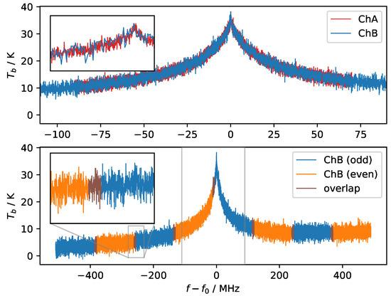 While both channels have the same ADC with a sampling rate of 200 MHz, we use fast Local Oscillator (LO) switching to scan a broader band with ChB. This method switches the LO frequency of the base band converter in ChB fast enough to cover multiple adjacent spectral regions. We chose a total of 8 different LO frequencies and take the central 125 MHz of each spectrum. The combination of the spectra is done so that we have a small overlap of a few channels between the different parts. Then, we average over 5 channels to reduce noise, which resulted in 2048 channels per LO frequency. The details (binning, overlap, and bandwidth) are chosen so that the combined spectrum has 16,384 (, same as ChA) channels and a 1 GHz bandwidth, which gives a channel resolution of 61 kHz.