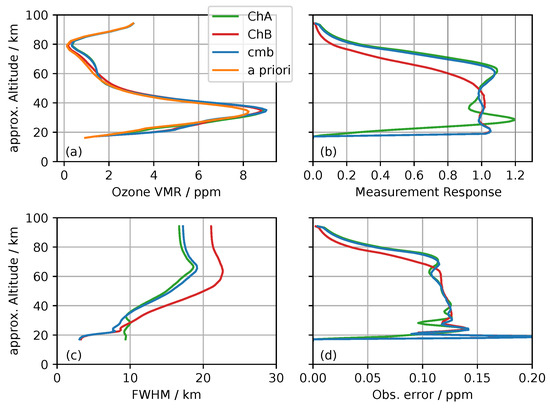 Ozone retrieval for three different spectra: ChA only, ChB only, and combined (cmb). Shown are the (a) ozone VMR, (b) the measurement response, (c) the full width at half maximum of the averaging kernels, and (d) the estimated observational error.