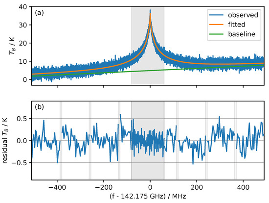 Measured and fitted spectrum for the combined (ChA and ChB) retrieval together with the baseline estimation (a). Residuals (b) are binned (64 FFTS channels), for each part separately. The spectral region from ChA is indicated by the gray area, and vertical gray lines indicate the boundaries of individual sub-spectra.