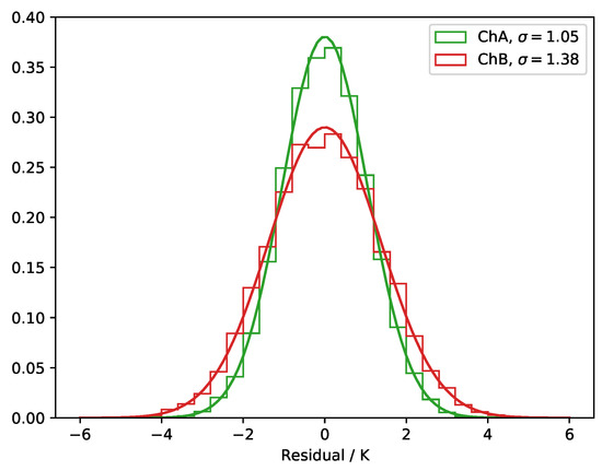 The residuals do not expose significant steps between the sub-spectra and are reasonably normally distributed as shown in Figure 5. Statistical evaluation shows no systematic dependency of residuals correlated with their origin (ChA or sub-spectra of ChB; no figure shown). The residuals of ChA have a standard deviation of 1.05 K, which is 1.31 times lower than the standard deviation of ChB residuals, which is 1.38 K. According to the radiometer formula, the relative noise between the two channels would be: