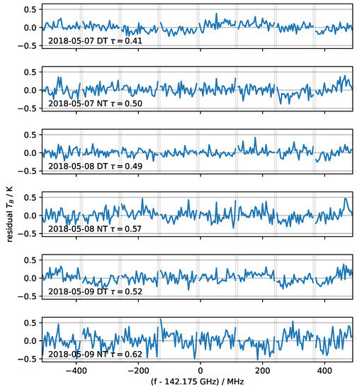 Residuals from six measurements taken during three days, daytime (DT) and nighttime (NT) obtained from the retrieval of ChB only. Residuals are binned (64 FFTS channels) for each part separately.