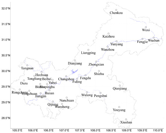 Map of 34 national meteorological stations in Chongqing.
