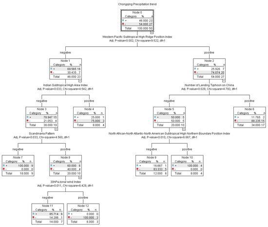 Considering the physical factors in the summer period, IBM SPSS Modeler 18.0 was used, and the CART algorithm (the same as below) was used to model (Figure 2). It can be seen from the model that the circulation index that has a large impact on summer precipitation in Chongqing includes the western Pacific subtropical high ridge line, landfall typhoon, SST in tidal zone, the northern boundary of the North African Atlantic North American High, polar vorticity in the Atlantic European region, Indian sub-high area, and 30 hPa zonal wind.