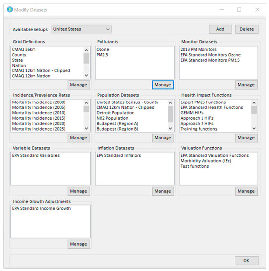 The BenMAP-CE program is preconfigured to perform PM2.5 and Ozone health impact analyses in the U.S. Analyses for other regions, including Budapest, require users to update the configuration, as described in Sacks et al. [8]. In brief, users load data including: (1) the geographic location of the analysis and the air quality modeling or monitoring domain (i.e., the “grid”), saved as a shapefile (*.shp); (2) the population counts for the domain, stratified by age, sex, race, and ethnicity; (3) the baseline rates of death and disease for each health endpoint quantified (in this case, mortality) stratified by age, sex, race, and ethnicity; (4) the health impact function, which incorporates the concentration-response parameter, as described above. All of the information preloaded within BenMAP—CE as discussed in Table 1, can be observed in the BenMAP—CE setup window (Figure 2).
