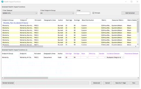Figure 3. BenMAP—CE health impact function selection window.