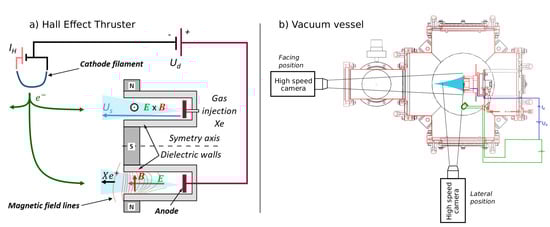 Schematics of: (a) a HET side view, with relevant parameters: discharge voltage , discharge current , cathode heating current and potential difference between the anode and the plume ; and (b) an experimental vacuum chamber with the two camera positions.